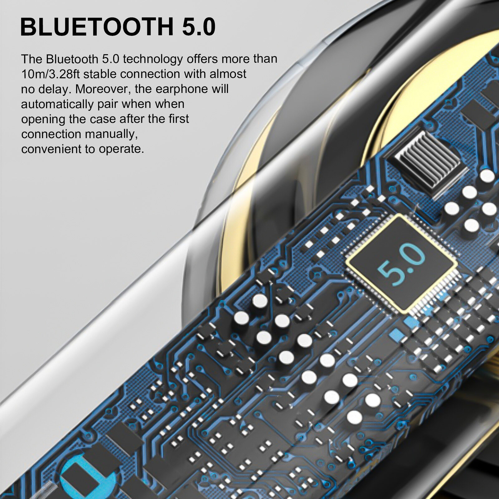 The Bluetooth 5.0 technology offers more than 10m/3.28ft stable connection with almost no delay. Moreover, the earphone will automatically pair when when opening the case after the first connection manually, convenient to operate.