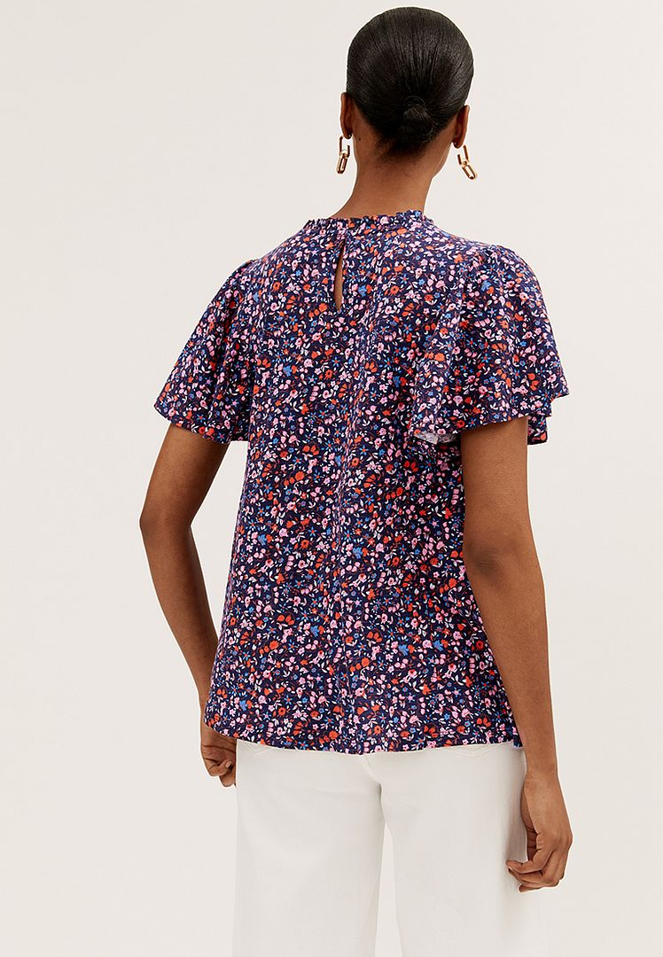 Bring a floral pop to your ensemble with this pure cotton top. Regular fit, with a shirred front panel and short ruffled sleeves for a fluttery feel. Crew neck gives a classic look. M&S Collection: easy-to-wear wardrobe staples that combine classic and contemporary styles.