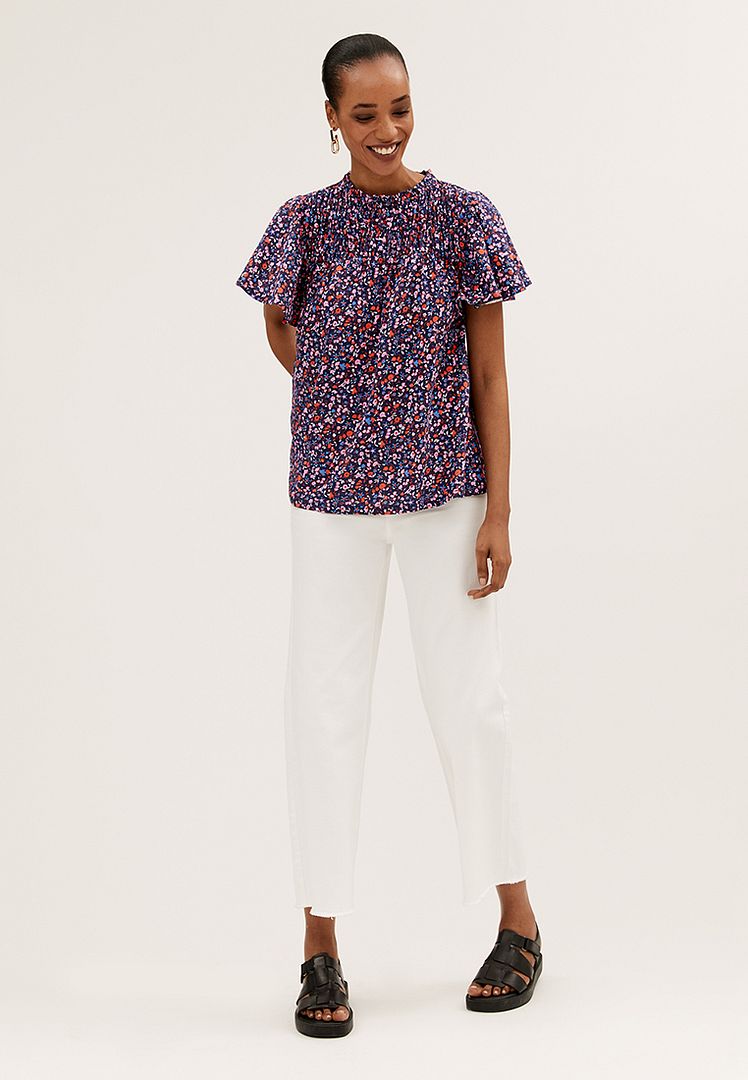 Bring a floral pop to your ensemble with this pure cotton top. Regular fit, with a shirred front panel and short ruffled sleeves for a fluttery feel. Crew neck gives a classic look. M&S Collection: easy-to-wear wardrobe staples that combine classic and contemporary styles.