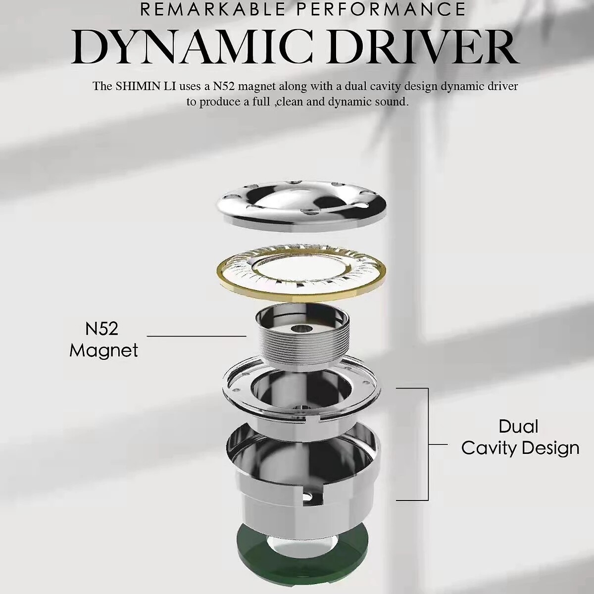 The SHIMIN LI uses a N52 magnet along with a dual cavity design dynamic driver to produce a full,clean and dynamic sound.