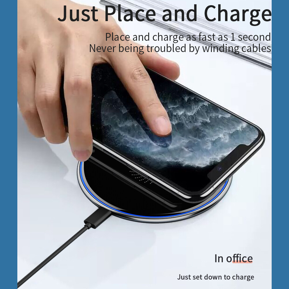 6, with a soft breathing lamp Not dazzling Convenient search for mobile phone charging indicator state is introduced at night (1, wireless charger plugged in the blue light is lit up for 3 seconds and extinguish recharge equipment 2, equipment to charge indicator is blue Blue light when charging is one bright one dark alternate 3 a foreign body, blue indicator flash block or cellphone partial)