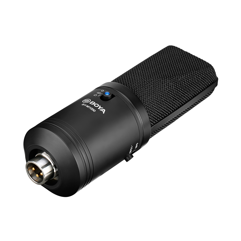 The BOYA BY-M1000 is a 34mm/1.3in diaphragm condenser microphone, with sturdy all-metal housing, it can be mounted on 5/8 inch arm stand. Included shockmount & pop filter.