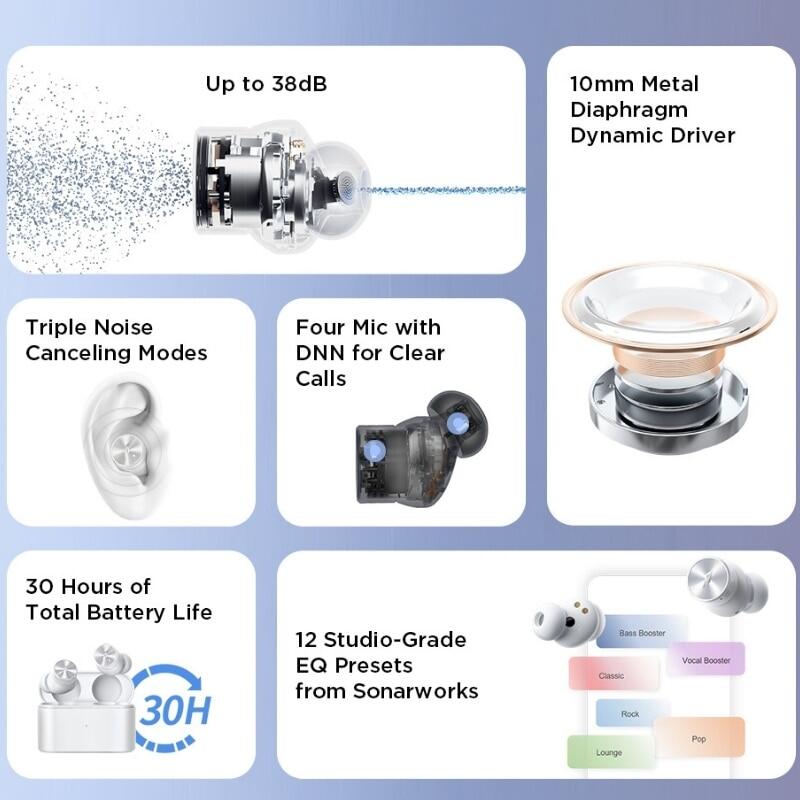 Up to 38dB Hybrid Active Noise Cancellation Technology