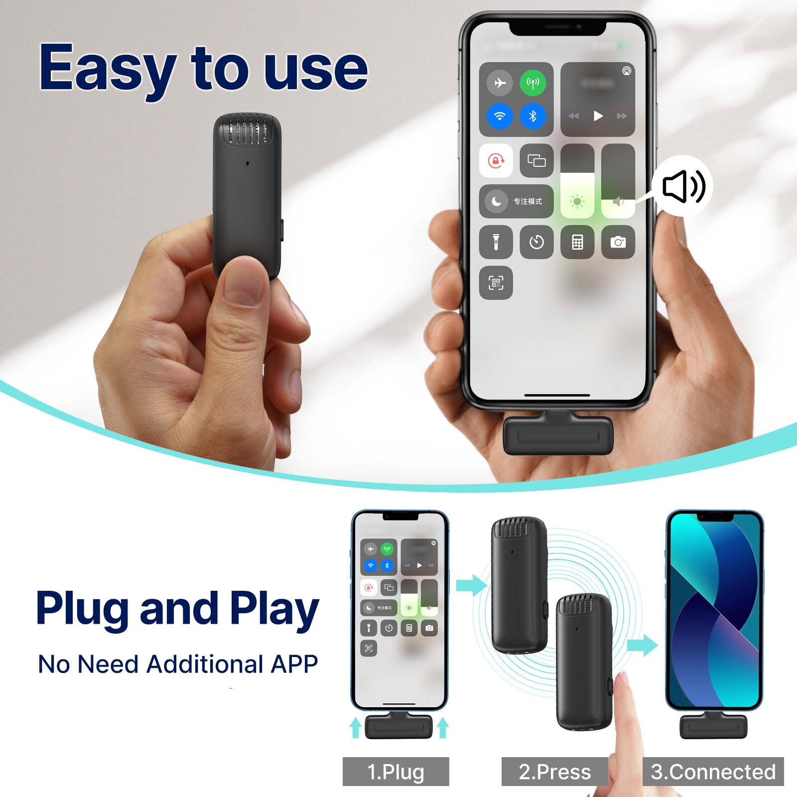 Including 1 receivers & 2 microphone transmitters, supports dual microphone simultaneous recording, plug-and-play, no APP needed, very suitable for phone vlog, live streaming, interview, online chatting, etc.