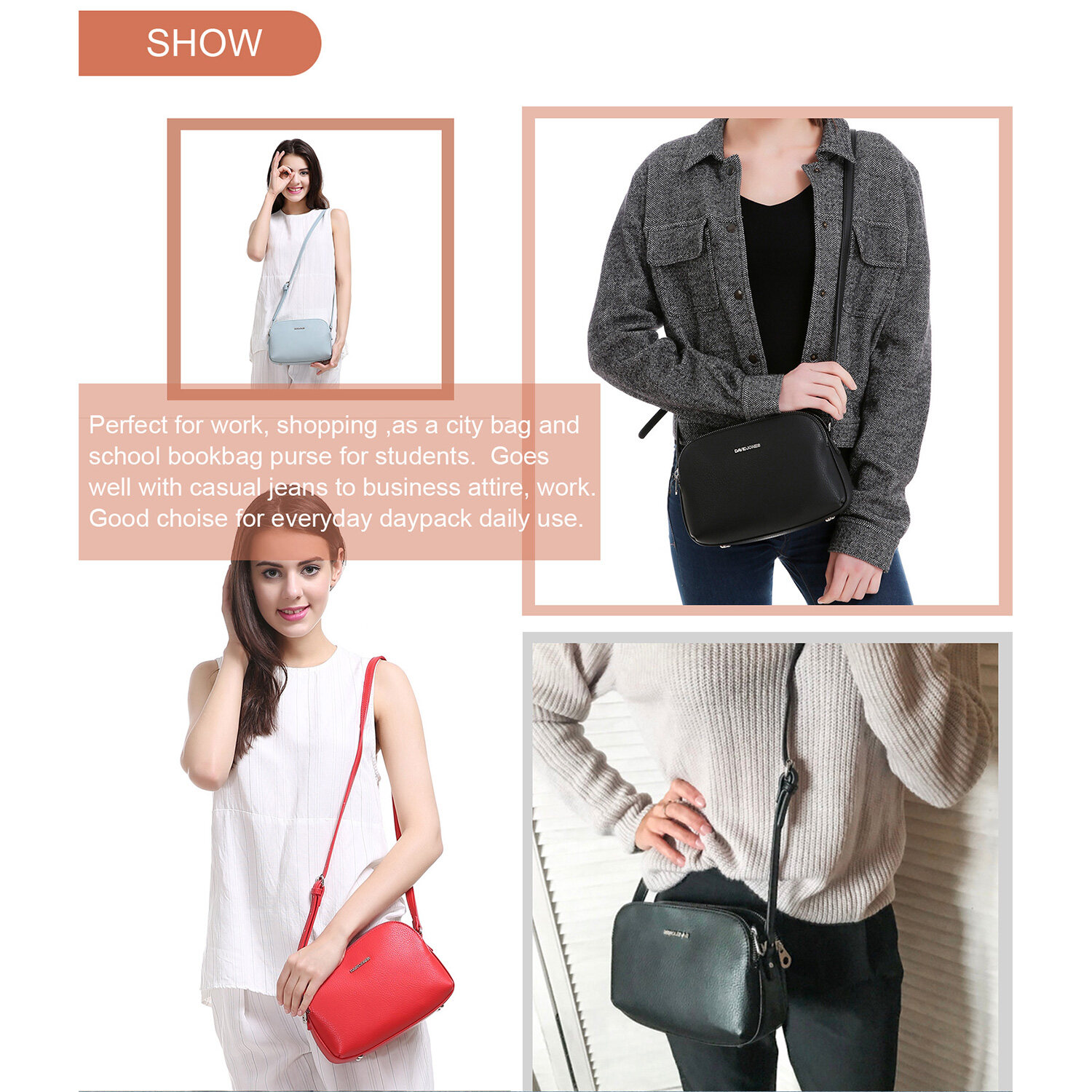 A perfect match for any casual daily outfit, like in office, school, travel, date, shoppng or any other daily occasions, highly recommend for girls who always packed light (wallet, small make up kit, phone, some cash, lipstick, compact powder, keys and perfume)