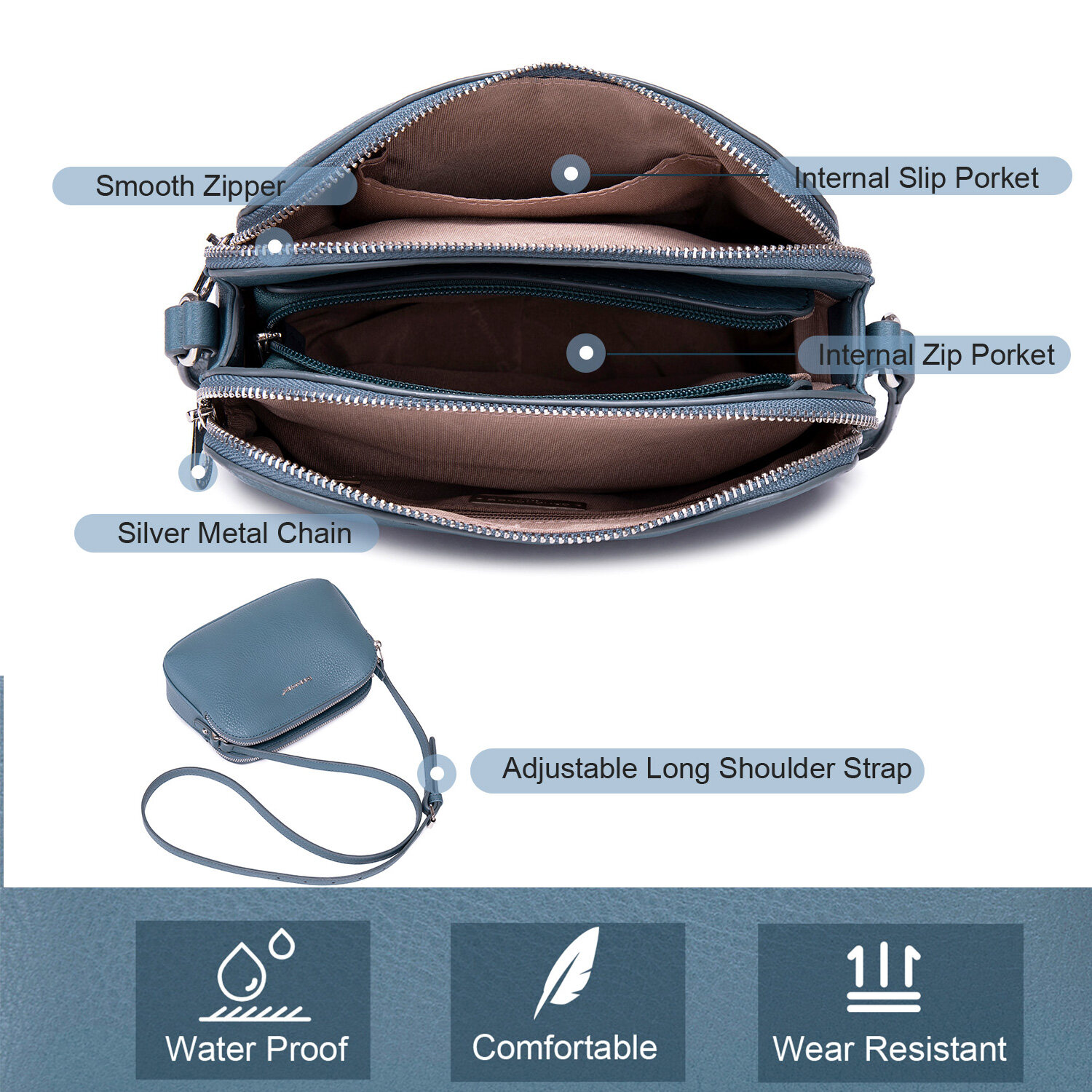 Product feature: 1 adjustable and long shoulder strap,2 zipper Closure main compartments; 1 internal zip pockets; 1 internal slip pockets for small travel essentials; patchwork decoration in the front