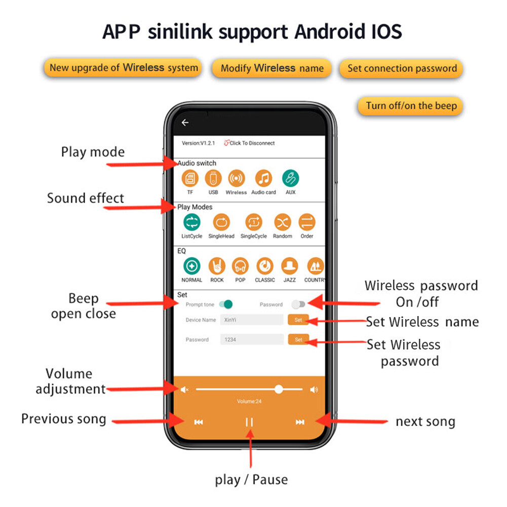 Unique functions: support Sini link-APP, modify Bluetooth-compatible name, set Bluetooth-compatible password, turn off/on the prompt sound