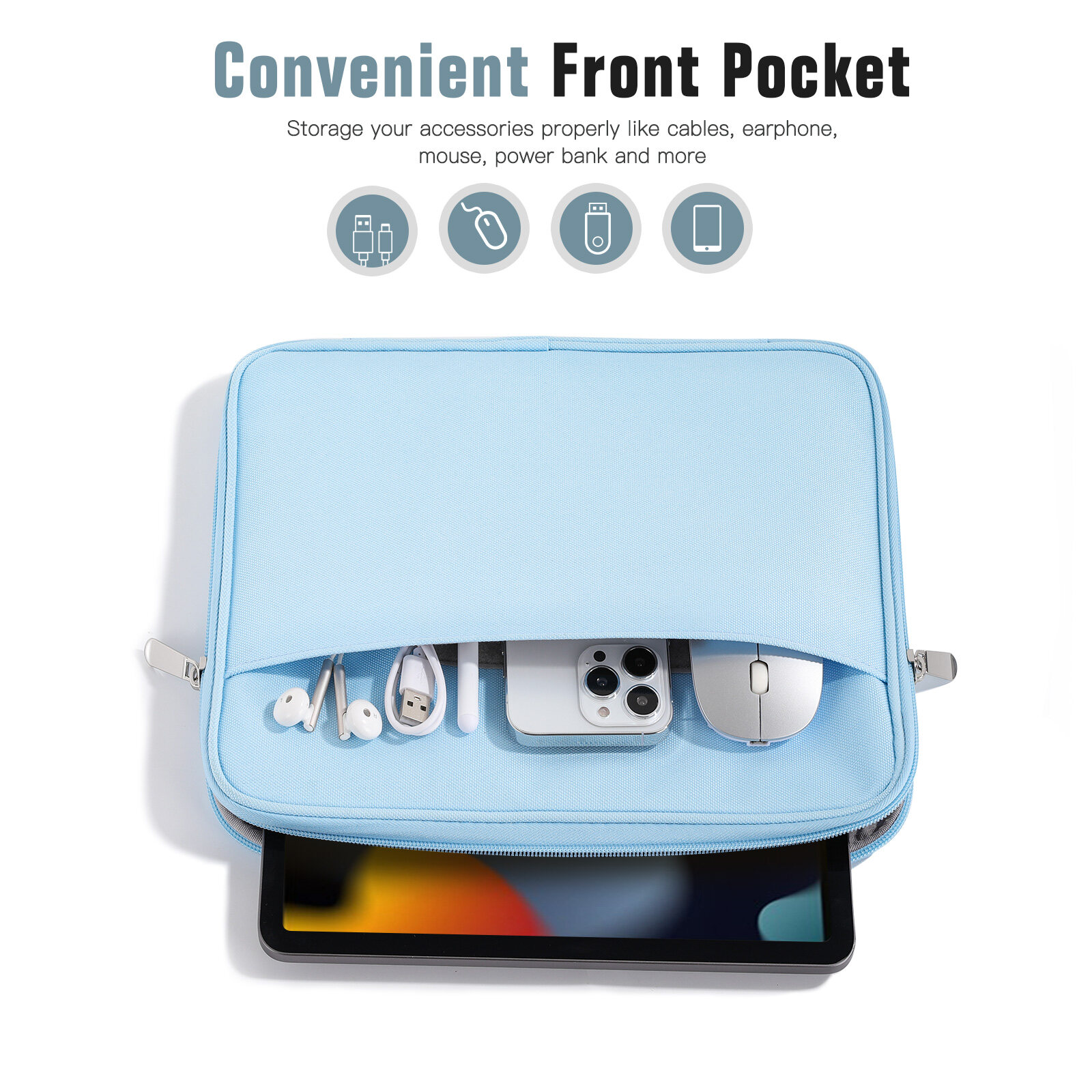 There are multiple compartments to store your items. The main compartment is for a tablet. Outer pocket can store notepads, documents, etc. Dual inner side pockets are suitable for storing iPad, power bank, chargers, pens, mouse, and so on. Inner mesh pocket can store earphones, airPods, cables, etc.
