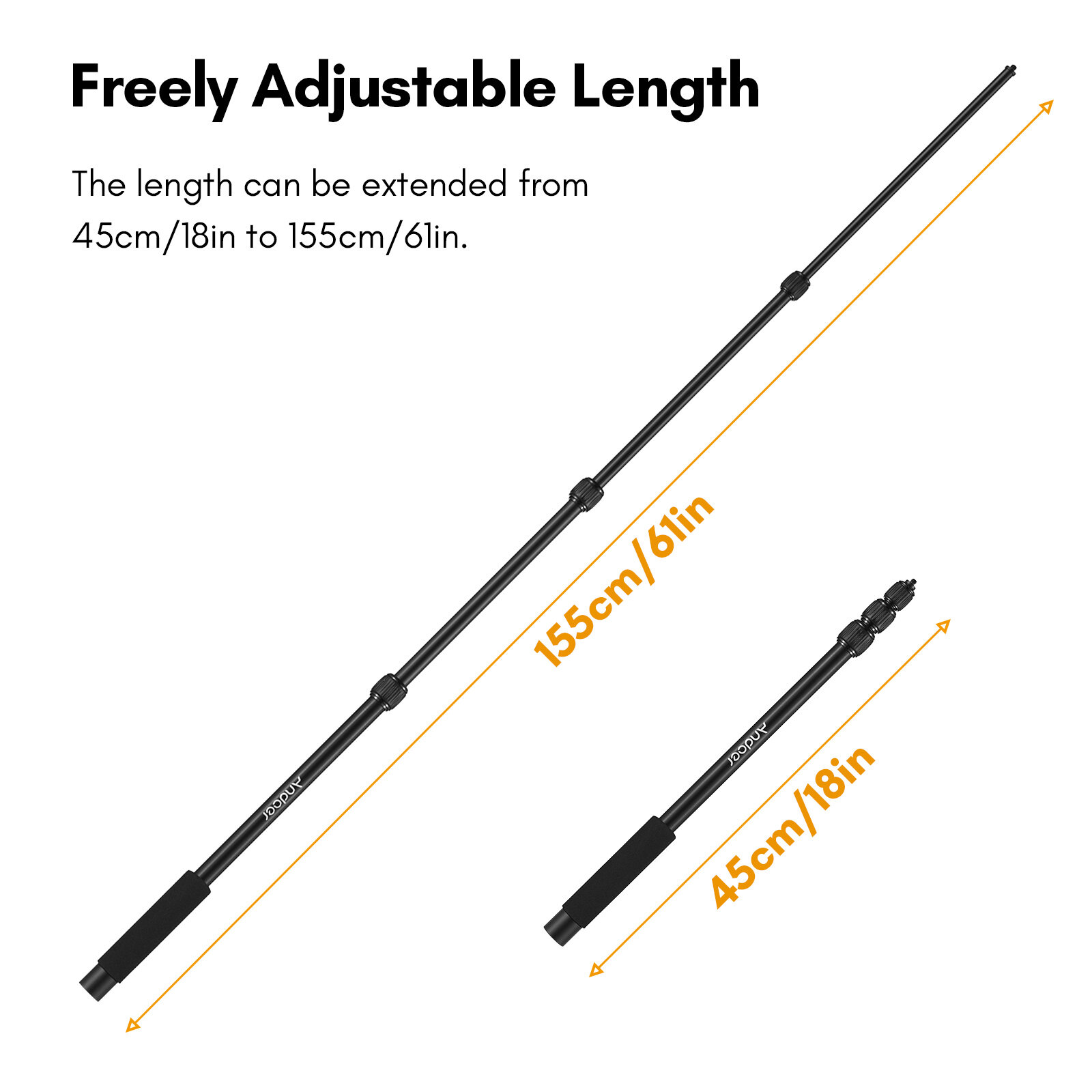【Adjustable Length】4-section telescoping design, you can extend the microphone boom arm from 45cm/18in to 155cm/61in. With twist locks to ensures quick and secure locking between each section.