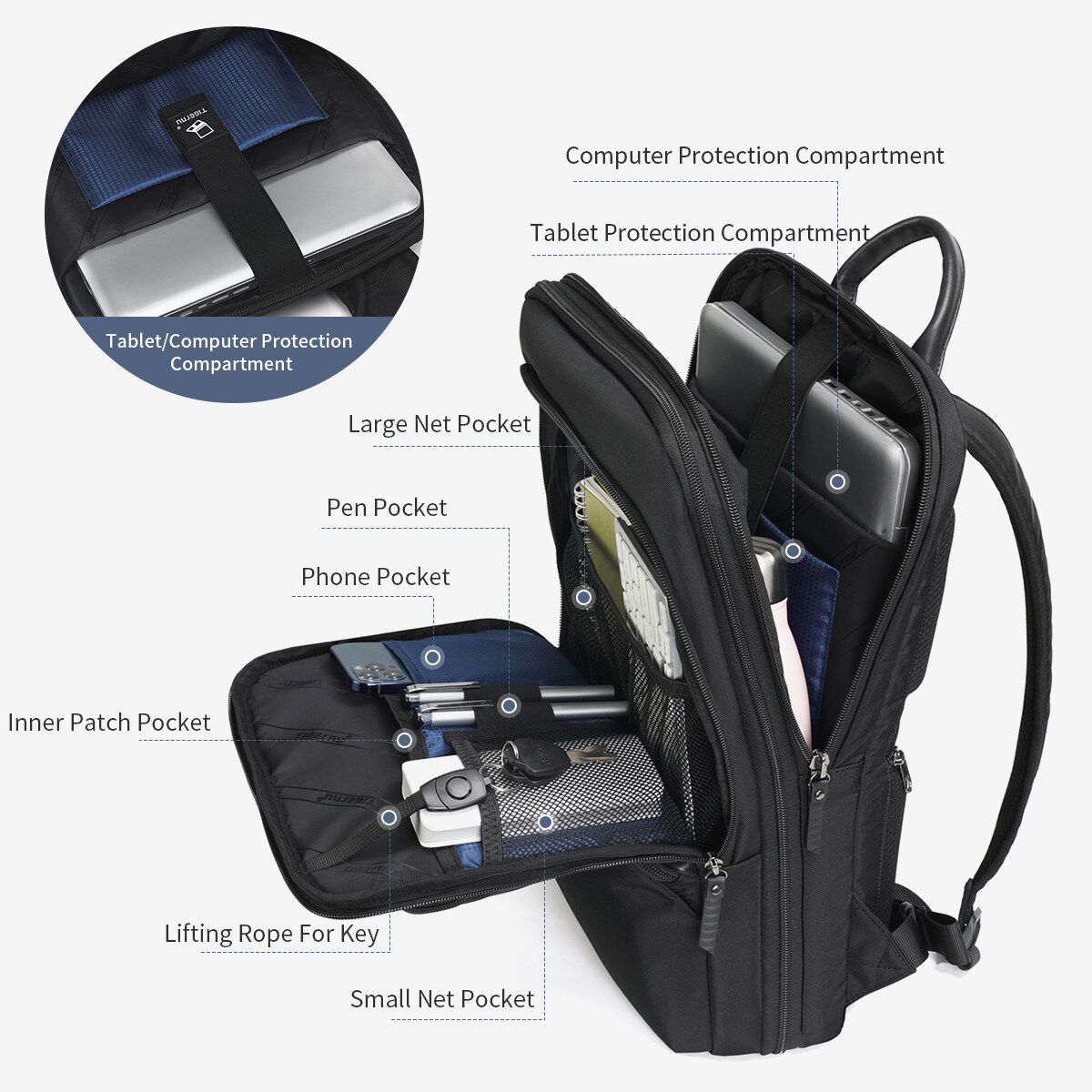 4. Multi-functional pocket & Multi-layer space: 15.6inch Laptop Protection Compartment & Tablet Protection Compartment & Phone Pocket; Large Net Pocket & Small Net Pocket;