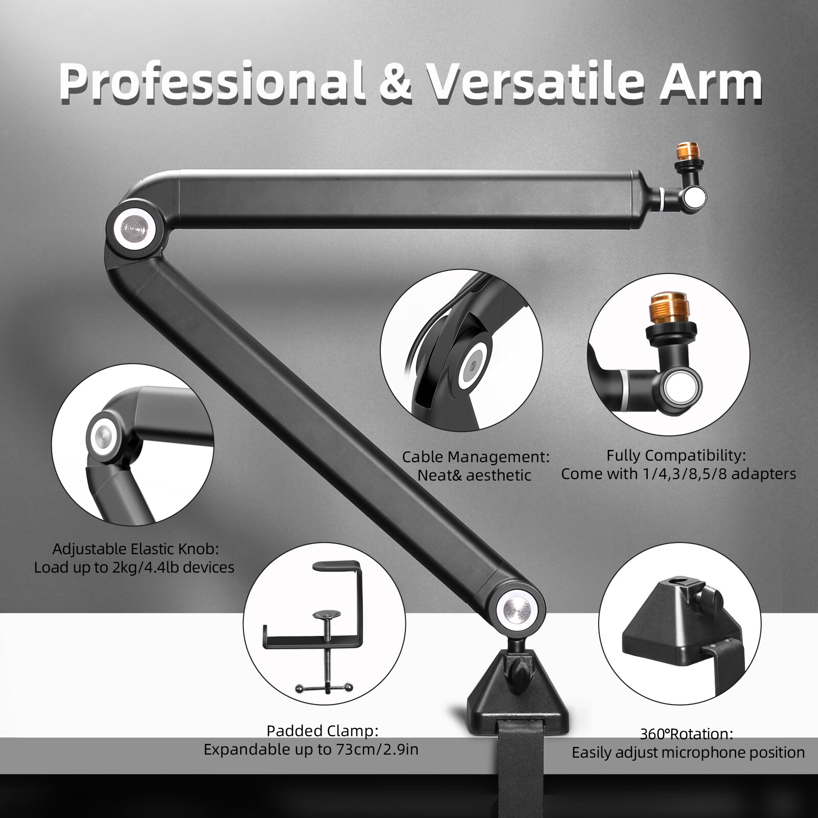 includes 3/8'' to 5/8'' adapter to connect most shock mounts and professional microphones such as Blue Yeti, Nano, Ice Snowball, Razer mini, RODE, Hyperx Quadcast and other microphones. The specially included 3/8'' to 1/4'' adapter allows you to connect cameras, smartphones and other devices (up to 2KG) to meet your diverse creative needs.