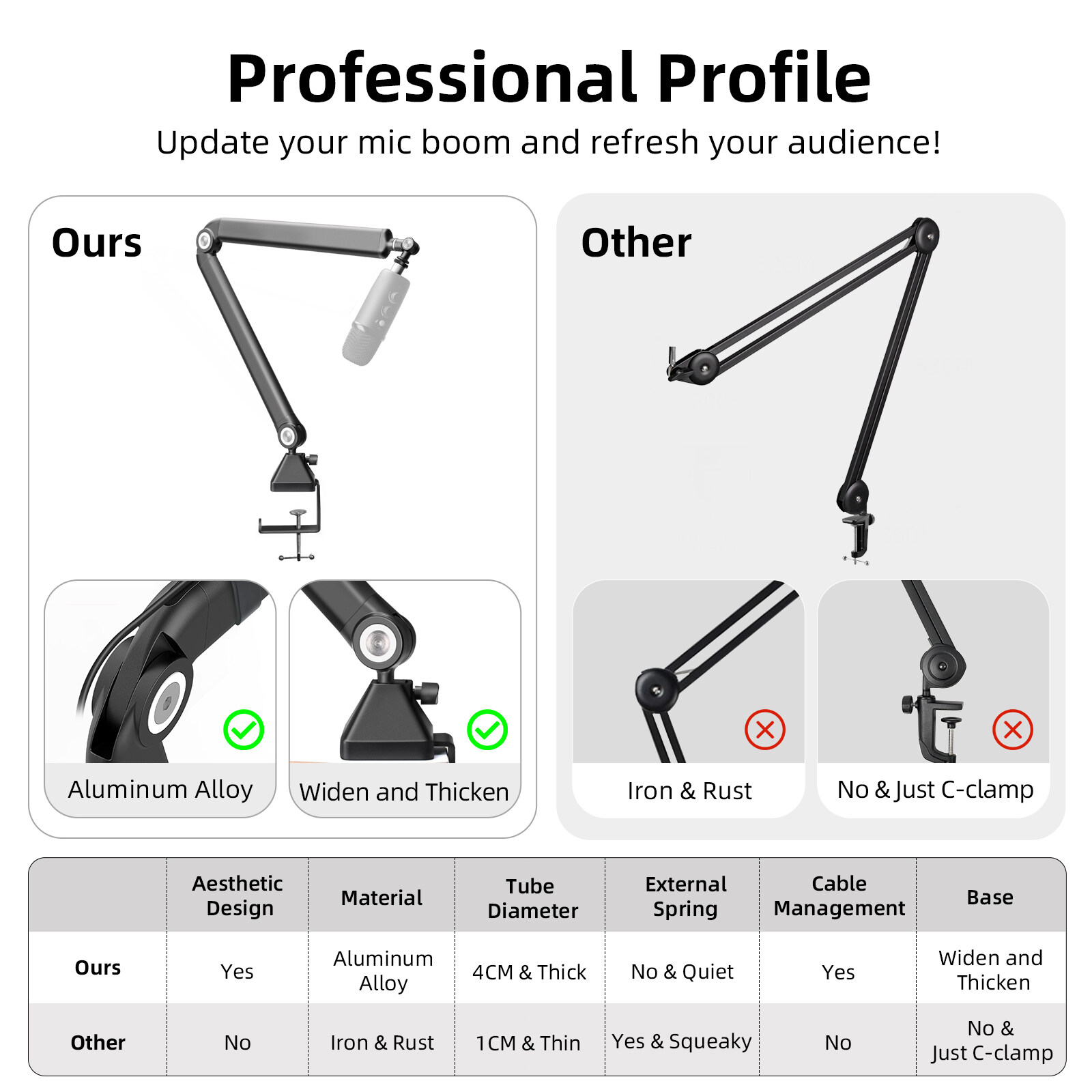 Our professional microphone boom is a tubular one-piece design with all aluminum alloy material, which can support up to 2kg weight of microphone and shock mount, designed to help you in podcasting, gaming or streaming work to optimize your sound. Compared to older scissor booms, our professional booms have no external springs, move without creaking, easily lock in the angle you need and won't bounce back.