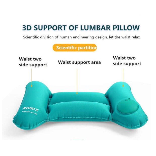 Travel Pillow - Back CushionTravel Pillow for Back> Inflate by hand, instead of mouth> Simple> Quick Air Inflation> Light Weight Design, Small and Easy to Carry> High Elasticity > Comfortable> Curve Fit For Lumbar> Arc Design, Closely fit the human spine curveHow to inflate?Open the Leak Prevention DeviceCover the Rear Outlet ValveRepeat pressing the Inflatable Valve with both handsOnce inflated, close the Leak Prevention DeviceTo deflate, just open the Rear Outlet Valve to release the air.