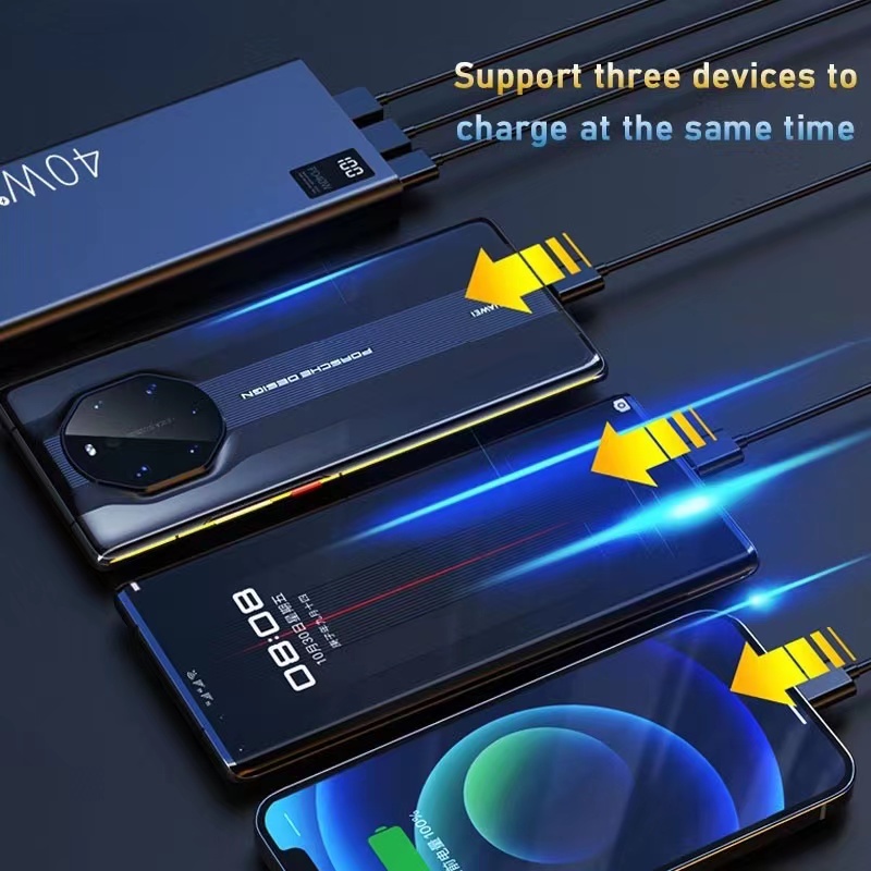 The mini power bank is actually really mini, one is small and easy to carry, very mini, and the other is very beautiful, and its appearance is fascinating. Of course, I know what everyone cares about most is its quality. Such a small body has a large capacity of 20000hAm. The key is that it is also equipped with this 2.1A efficient fast charge. Its little heart is charging. Other power banks are 60% faster and can charge up to 5 electronic devices simultaneously. For everyone's convenience, we have installed four cables in its body, which is convenient for you to use on mobile phones and tablets without charging cables. When the electronic device is charging and needs to be charged, pull the power cord out of its body. After charging, you can put the power cord back into the body. This is convenient for everyone to charge, and will not be stuffed into a school bag or bag. Messy, clean, tidy, would be a pleasure to see. It is indeed the embodiment of high technology. Full mirror capacitive screen, LED display, how much power, two external output, three external output, at a glance. This project comes with wired output, and there are two LEDs on the surface to help you illuminate the road in the dark, easy to use and considerate. Polymer batteries are faster and safer. Introduced smart battery, charging speed increased by 70%