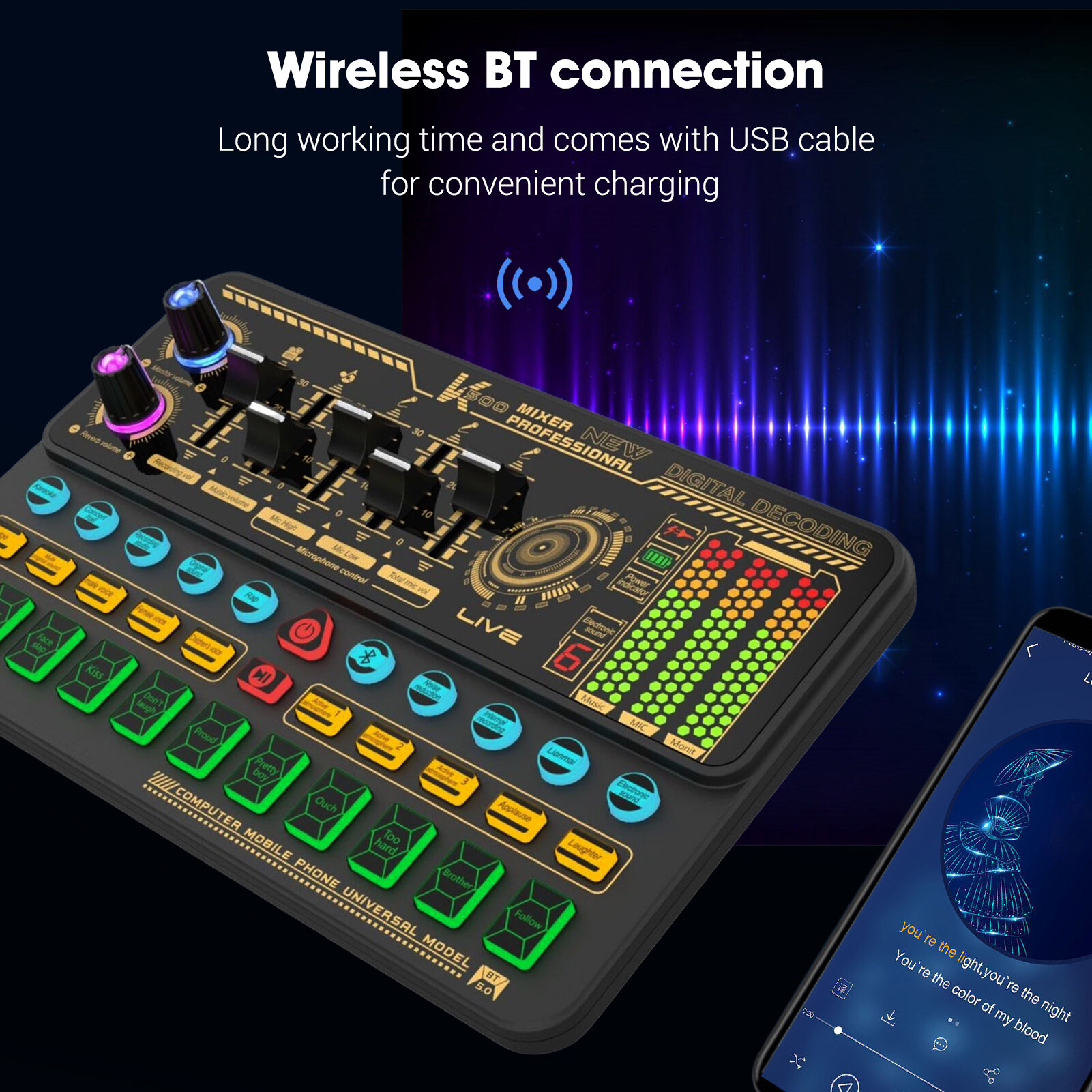 Portable and Eye-catching: Built-in rechargeable lithium battery and compact size design, you can carry the sound card around and use it anytime anywhere; and the colorful button light effects make it look super cool at night.
