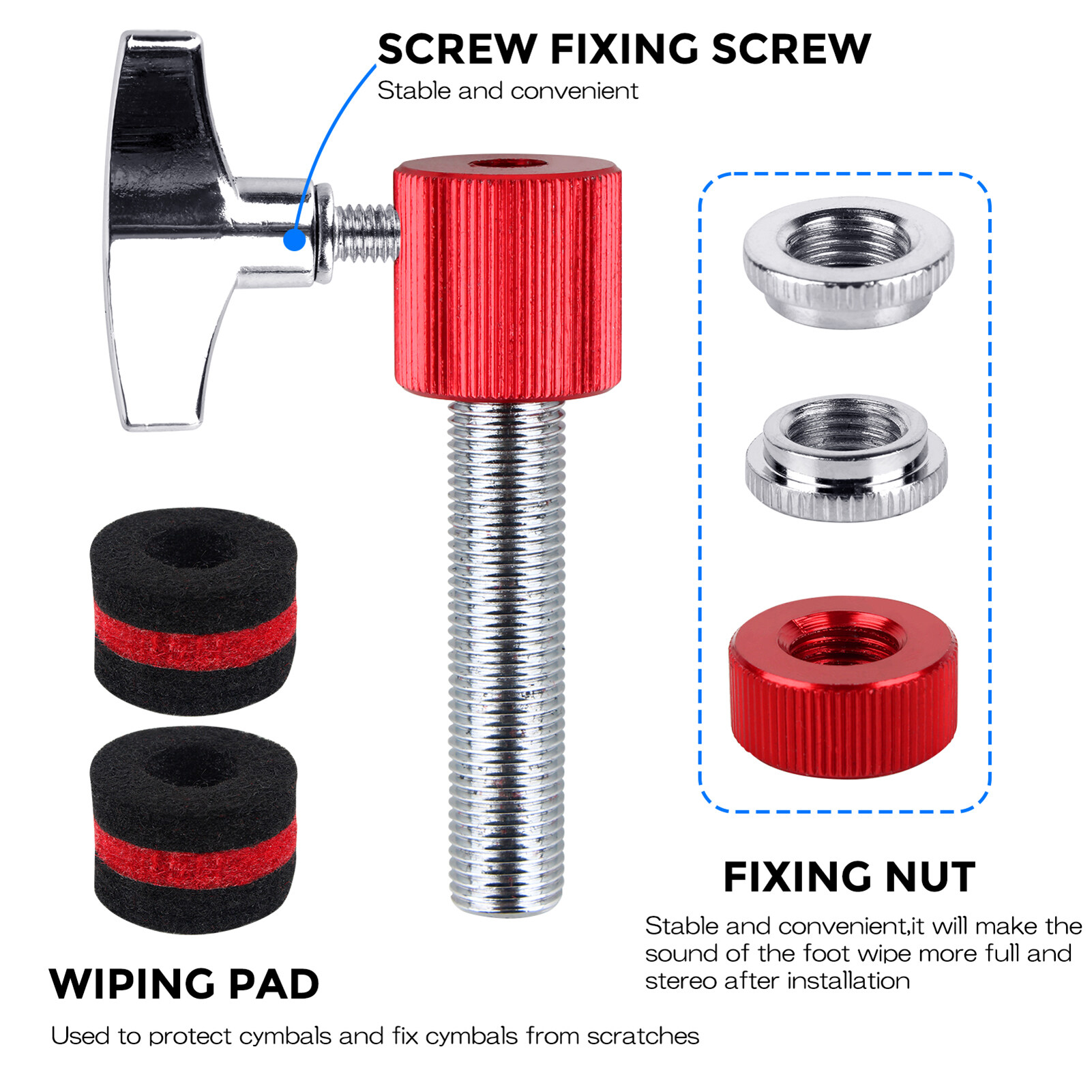 Features: * Made of high quality aluminum alloy, resistant to rust and corrosion, more durable to use. * Two wiping pads, bring high comfort, better protecting cymbals and fix cymbals from scratches. * With exquisite craftsmanship and stable performance, it is a perfect replacement for the old or broken one. * Easy to install and use. Compact body covered with stylish color, makes it an excellent accessory for drum.