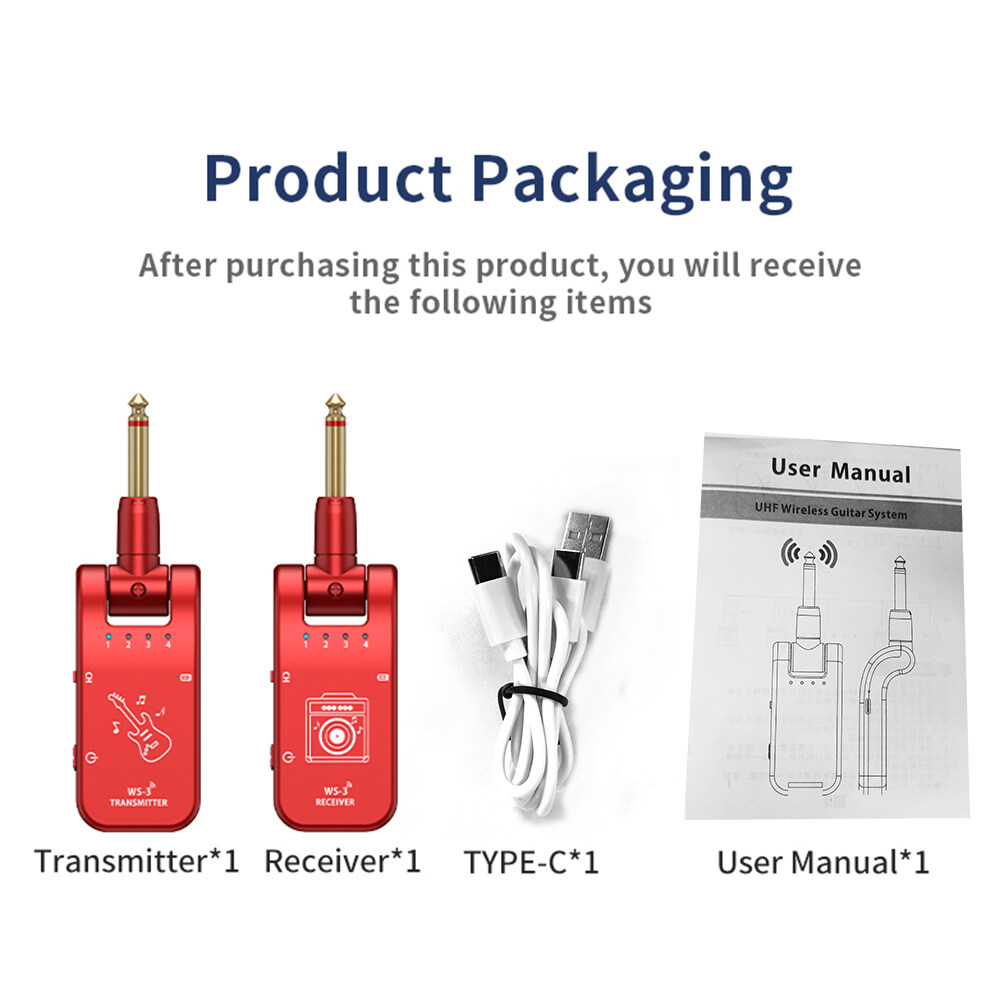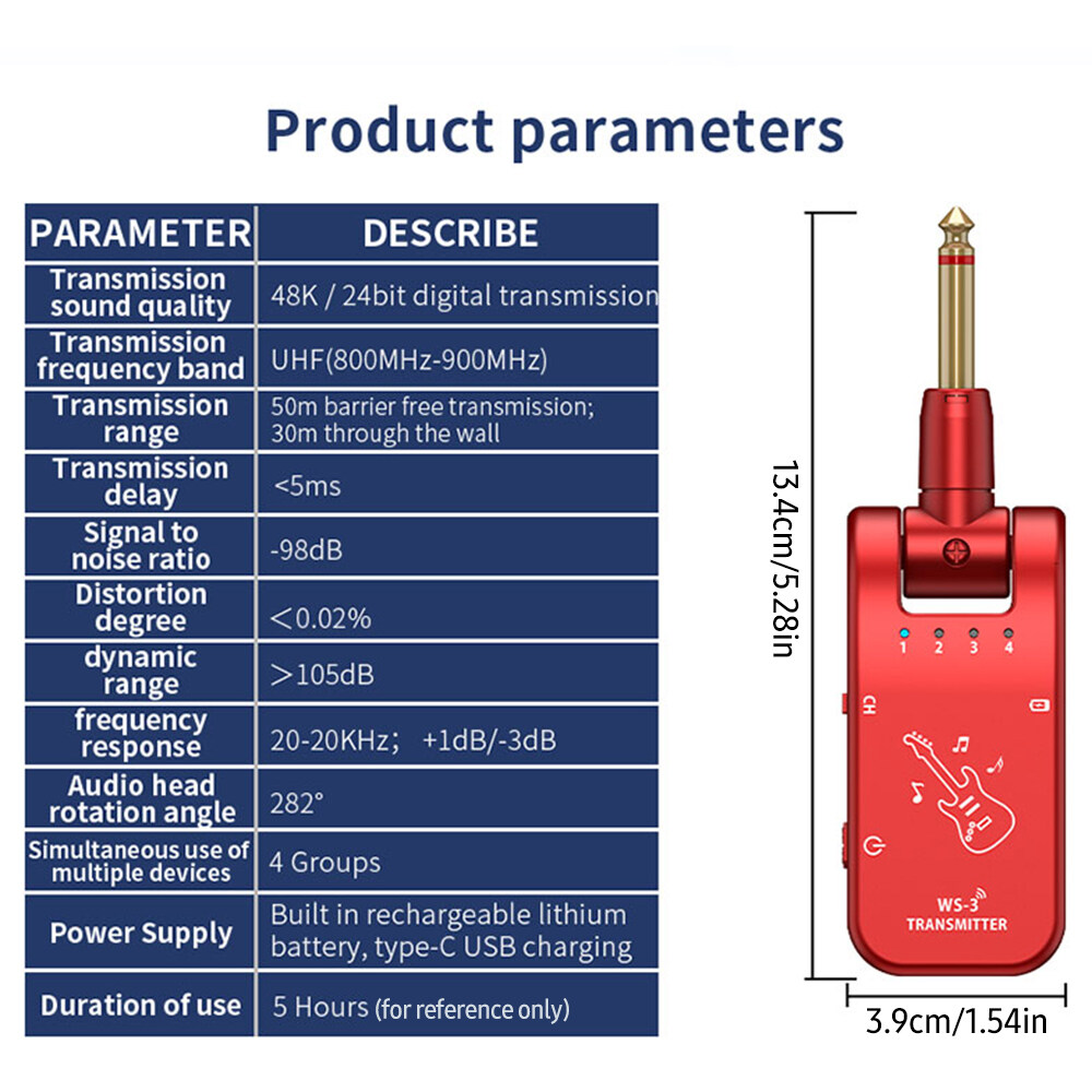 This is a multifunctional wireless audio system designed for electric musical instruments. The transmission frequency band is 800MHz-900MHz, the transmission range is 50m barrier-free and 30m through the wall. With ultra low delay, original sound quality transmission, strong anti-interference, 282-degree rotation 6.35mm audio interface, built-in rechargeable battery, the system is flexible to use, making music more free.