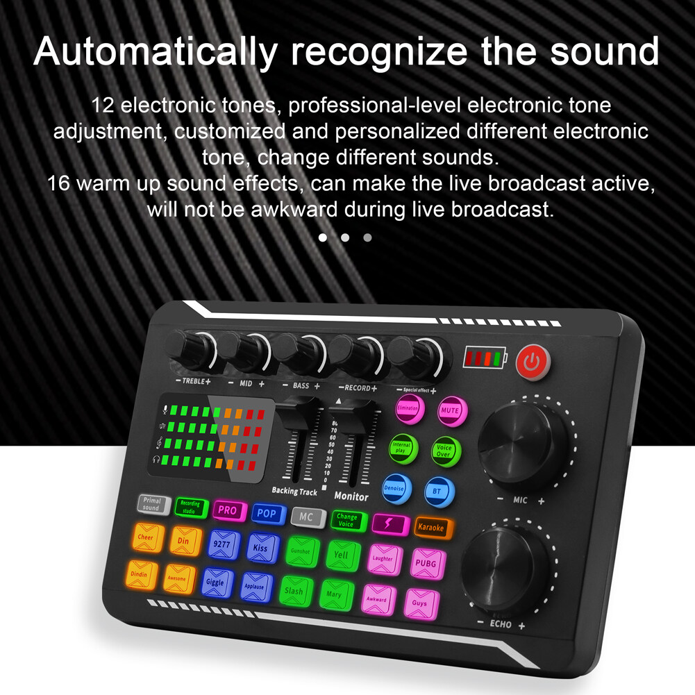 This F998 sound card adopts powerful audio chip, with stable signal, nice sound quality and without delay. Tuning knob design, with 12 kinds of electricity sound and 16 warming up sound effects, support elimination of common sound, live singing, one-button avoidance, real-time monitoring. Intelligent compatible with phone/computer live broadcast, complete functions, simple operation, easy to use. You can have a try.