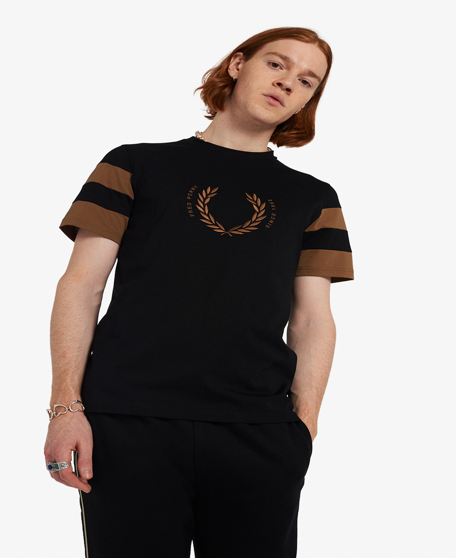 A crew-neck t-shirt in cotton jersey, designed with a large-scale Laurel Wreath graphic, printed and embroidered at the chest and bold tipping to the cuffs.