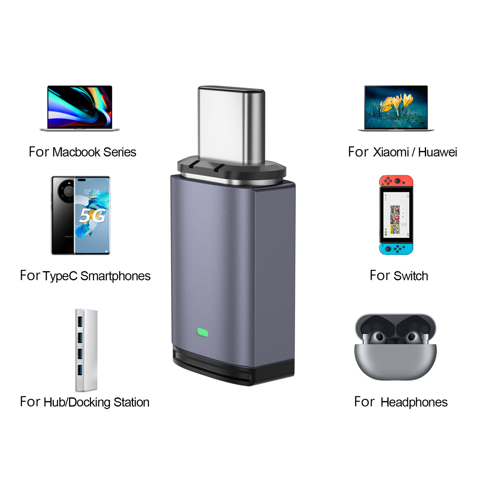 2. Both Charging and Transmission:Standard USB2.0 interface, support PD fast charging, maximum 100W charging, 480Mbps transmission rate, connect to the network through HUB, read U disk, read SD card, etc.