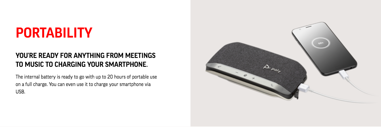Let’s face it: the audio on your laptop and smartphone aren’t great. Sound like the professional you are with Poly Sync 20 USB/Bluetooth® smart speakerphone—for remarkable conference calls and music anywhere. Take it wherever you go—its battery lasts for hours and can charge your smartphone. You’ll always hear and be heard. The multimedia quality sound is a music-lover’s delight. Designed specifically for today’s professional, it’s sleek, compact, and filled with smart features to keep conference calls simple.