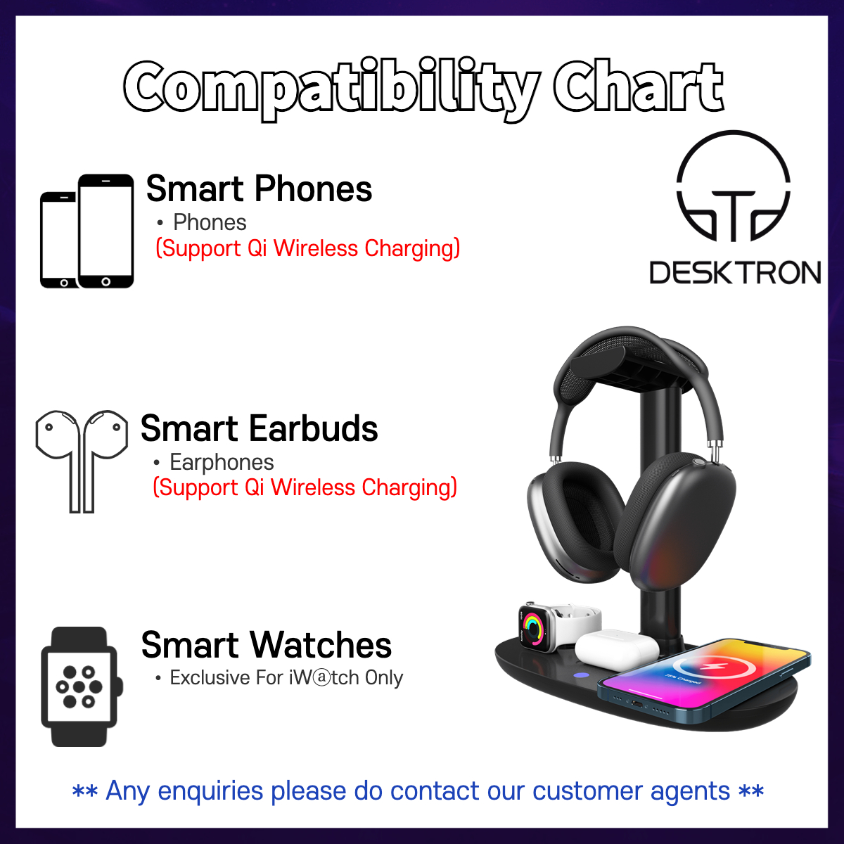 - Wide Compatibility: Mobile Phone wireless charging supports iPhone and phones supporting Qi Wireless Charging. Watch Wireless support APPLE WATCH ONLY. The headset supports Airpods and Qi wireless charging headsets. An additional UBS port is built in to charge your headset.