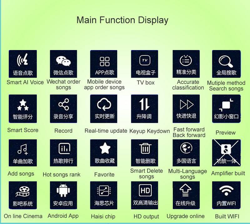 3.Smart AI Order songs,Record and share.The mainboard support two system.Chinese universal system and International system.You could select a suitable one.Universal system could support Simple Chinese,Traditional Chinese,English operation menu and searching.International system support more than 10Countries language menu and searching. Also International system songs category is more than Universal system. Chinese Universal system support Smart AI,Record and share.Score.
