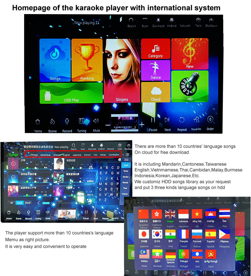 3.Smart AI Order songs,Record and share.The mainboard support two system.Chinese universal system and International system.You could select a suitable one.Universal system could support Simple Chinese,Traditional Chinese,English operation menu and searching.International system support more than 10Countries language menu and searching. Also International system songs category is more than Universal system. Chinese Universal system support Smart AI,Record and share.Score.