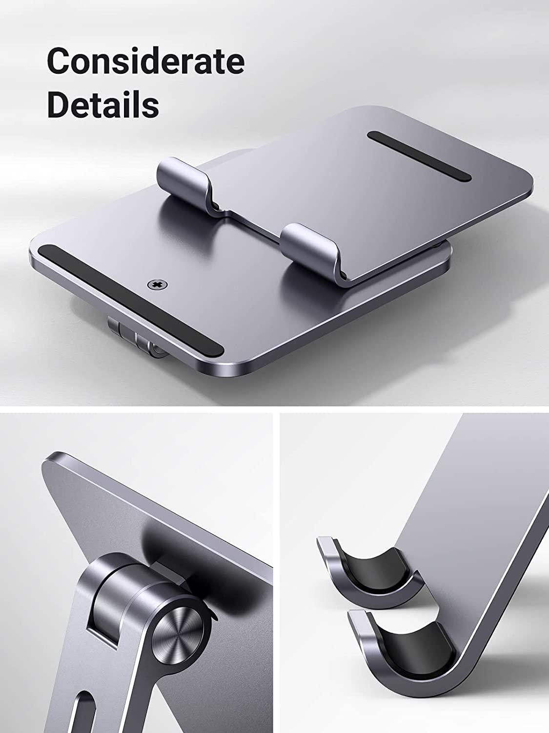 - Heavy Duty Ipad Holder: Made of full aluminum alloy material, along with a thicker, bigger base and a center of gravity design, this ipad stand for desk adjustable aims to achieve superior stability and durability. Compared with the ordinary tablet stand for desk using plastic, the weight is increased by up to 50% (14 ounces) and larger (4.72*6.7 inches), and it provides 10 times stable support without shaking, which is very suitable for large-sized tablets, such as iPad Pro 12.9 Stand.