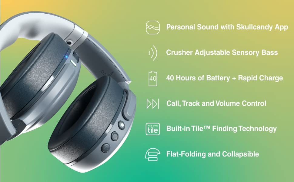 FEATURES Adjustable Sensory Bass Personal Sound by Audiodo™ Wireless via Bluetooth® 5 Up to 40 Hours of Battery Rapid Charge: 10 Minutes = 4 Hours Call, Track and Volume Control Activate Assistant Built-in Tile™ Finding Technology Flat-folding and Collapsible Compatible with Skullcandy App Travel Bag Back-Up AUX Cable USB-C Charging Cable