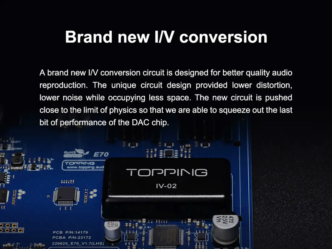 > The E70 uses the ESS SABRE ES9028Pro DAC chip, which boasts a 32-bit, 8-channel Hyperstream II architecture. In the E70, 4 channels are connected in parallel as one channel, achieving incredible power performance and sound quality.