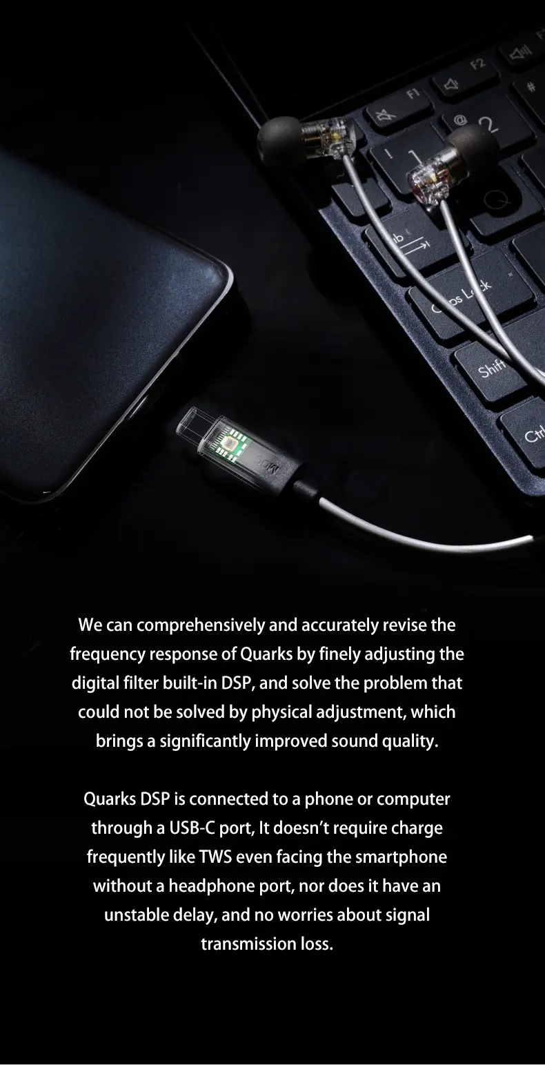 > Moondrop has accurately revised the frequency response of the Quarks. DSP by finely adjusting the digital DSP filter and it solves the problem that could not be solved by the physical adjustment. It is adjusted to bring a significant improvement over the OG model.