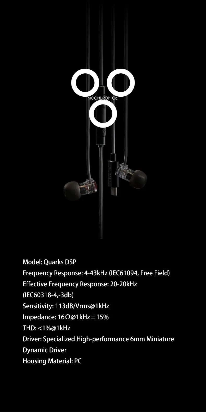 > Moondrop Quarks DSP houses a 6mm micro dynamic driver that has been adjusted using a high-damping acoustic structure, uses a polymer diaphragm, etc. Quarks deliver quality performance with powerful bass response, clear midrange, and engaging treble response.