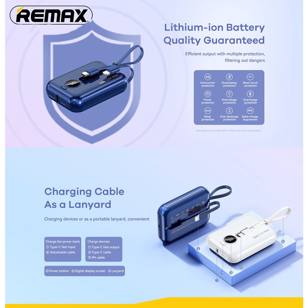 Cabled Power Bank * Model: RPP-301 * Color : Blue / White * Size: 83*61*25.5mm * Weight : 185g * Features: - Compact to hold in one hand - Two built-in cables, charging 3 devices at once - The built-in cable can work as a portable lanyard - Smart digital display, clear battery status - The charging cables are detachable