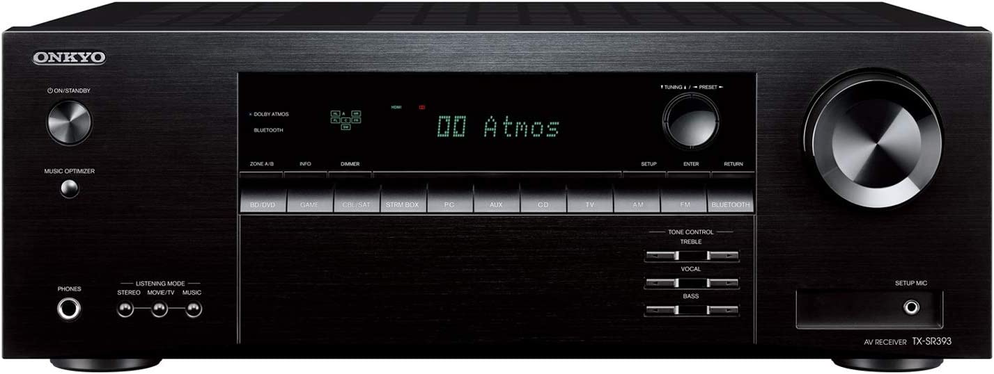 Premiere Dolby Atmos® and DTS:X® sound at home with the TX-SR393. Choose a speaker layout to suit your room, from a space-saving 2.1-ch setup enhanced with 3D surround-sound courtesy Dolby Atmos Height Virtualizer* or DTS Virtual:X® to a 3.2.2-ch system for native object-audio playback. Whatever way you play it, dynamic power is ready to thrill thanks to authentic high-current analog amps backed by a thumping custom transformer. For true-to-life video, the AVR supports 4K/60p and HDR video passthrough. If all this tech sounds scary, relax: every aspect of this product is designed to erase frustration, from the automated AccuEQ system calibration to quick connection guide. The receiver integrates your players and TV and adds practical features such as Vocal Enhancer for clear dialog. There’s even a Zone B line-out to distribute all your home theater sources to a component with an analog RCA line in, such as a wireless headphone dock or hi-fi system. Or just sit back and stream from apps via Bluetooth® technology and let Advanced Music Optimizer™ enrich every note of the golden Onkyo sound.