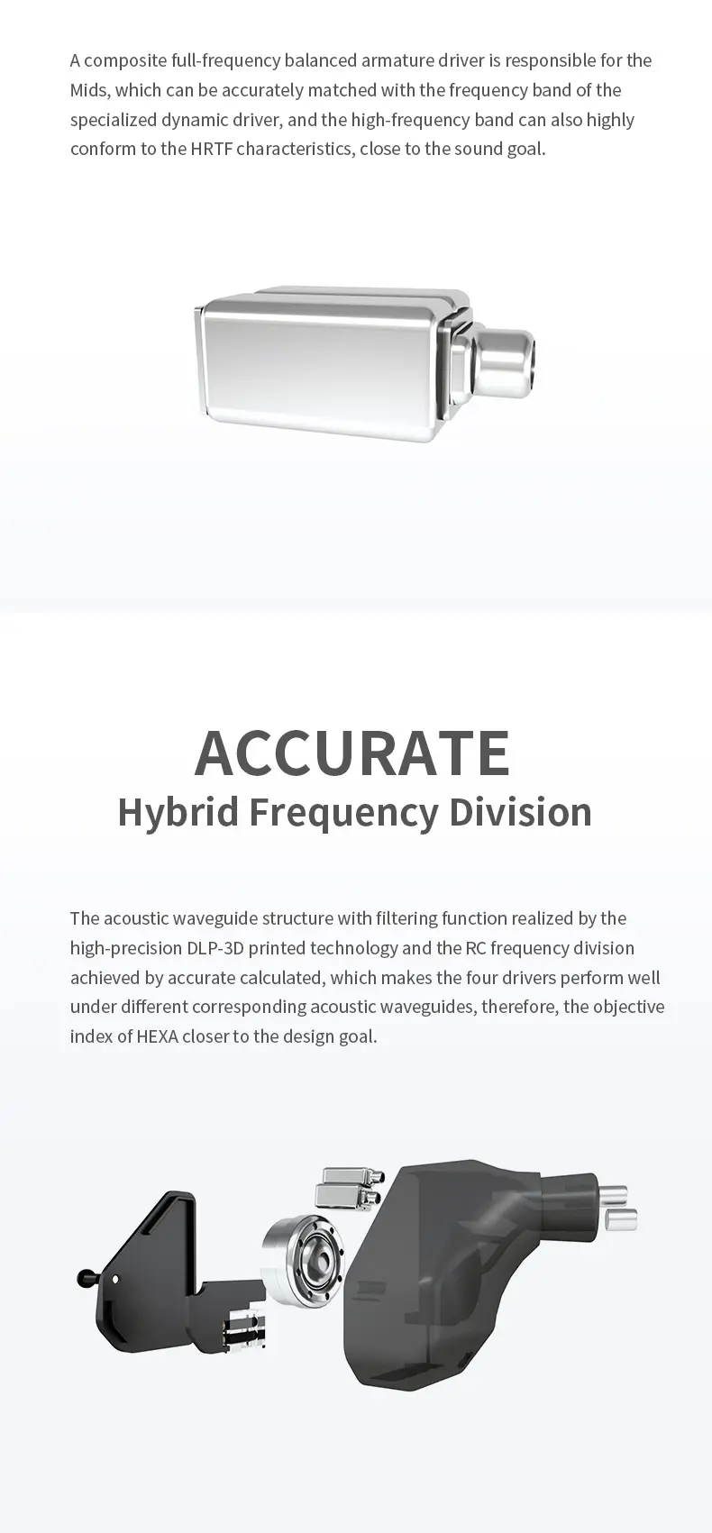 > A custom balanced armature driver, which is similar to the WBFK series, is responsible for the Highs, which not only makes up the bandwidth but also brings HEXA a smooth clear high-frequency performance through fine processing