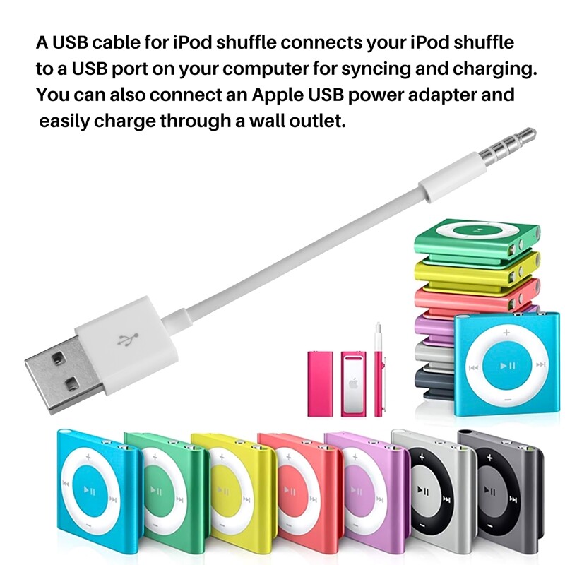 A USB cable for Apple iPod shuffle connects your iPod shuffle to a USB port on your computer for syncing and charging. You can also connect an Apple USB power adapter and easily charge through a wall outlet.