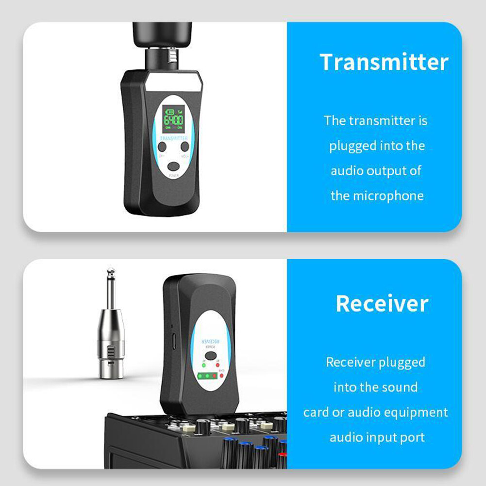 Feature: 1. Advantages and Scenarios: The microphone wireless transceiver solves the wireless audio signal transmission between the microphone and the audio, the mixer, and the sound card, realizing the expansion effect of wireless audio transmission, and solving the traditional wiring mode. This product is suitable for stage performances, outdoor entertainment, speeches, outdoor performances, and other places