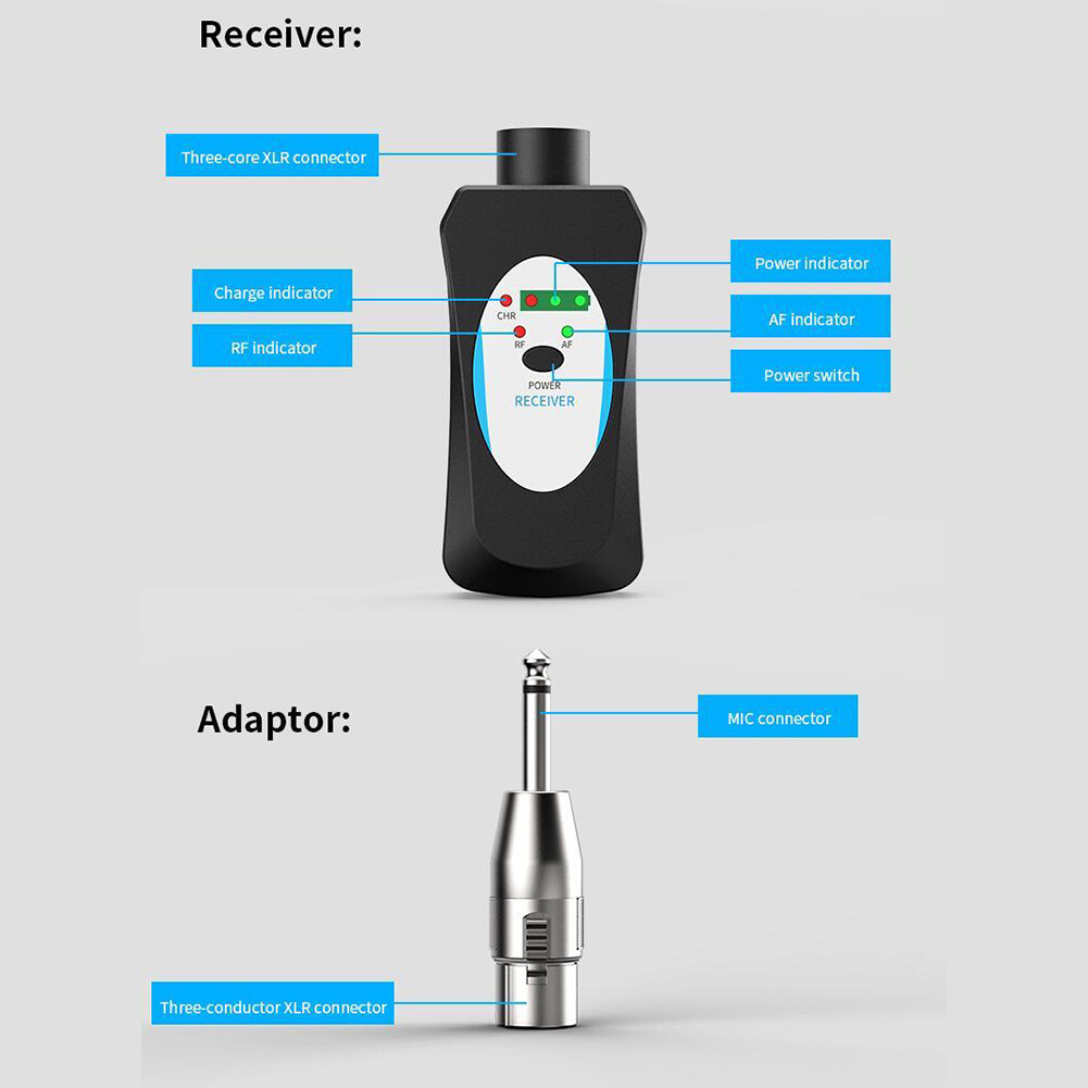 Feature: 1. Advantages and Scenarios: The microphone wireless transceiver solves the wireless audio signal transmission between the microphone and the audio, the mixer, and the sound card, realizing the expansion effect of wireless audio transmission, and solving the traditional wiring mode. This product is suitable for stage performances, outdoor entertainment, speeches, outdoor performances, and other places