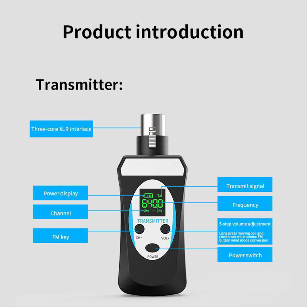 Feature: 1. Advantages and Scenarios: The microphone wireless transceiver solves the wireless audio signal transmission between the microphone and the audio, the mixer, and the sound card, realizing the expansion effect of wireless audio transmission, and solving the traditional wiring mode. This product is suitable for stage performances, outdoor entertainment, speeches, outdoor performances, and other places