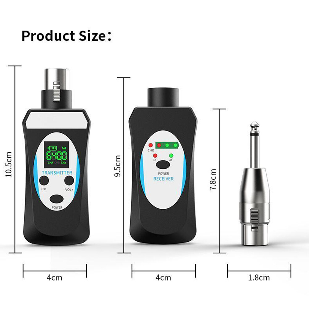 Feature: 1. Advantages and Scenarios: The microphone wireless transceiver solves the wireless audio signal transmission between the microphone and the audio, the mixer, and the sound card, realizing the expansion effect of wireless audio transmission, and solving the traditional wiring mode. This product is suitable for stage performances, outdoor entertainment, speeches, outdoor performances, and other places