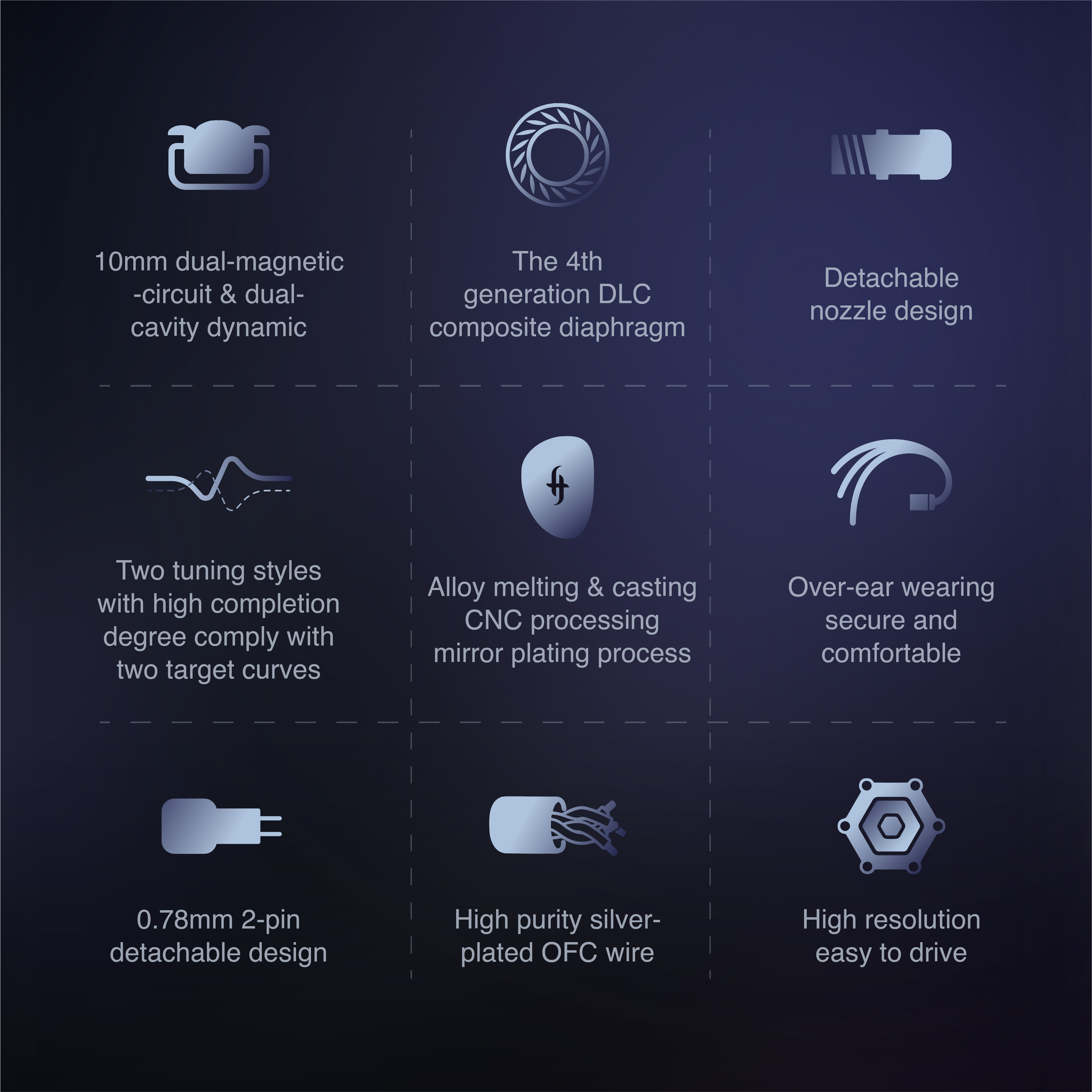 - ♪【A Clever Blend of Three Materials】The DLC composite diaphragm of EA500 IEM headphones incorporates 3 kinds of different materials, which are used to build different parts. DLC is characterized by strong rigidity, high damping, and light-weight, and is used as a dome that determines the characteristics of treble. The surround, which affects the mid and bass, is built with elastic composite material. The whole diaphragm has undergone multiple pattern design and material content ratio tests to achieve surging and natural bass, high resolution and high-density mid, and smooth treble extension.