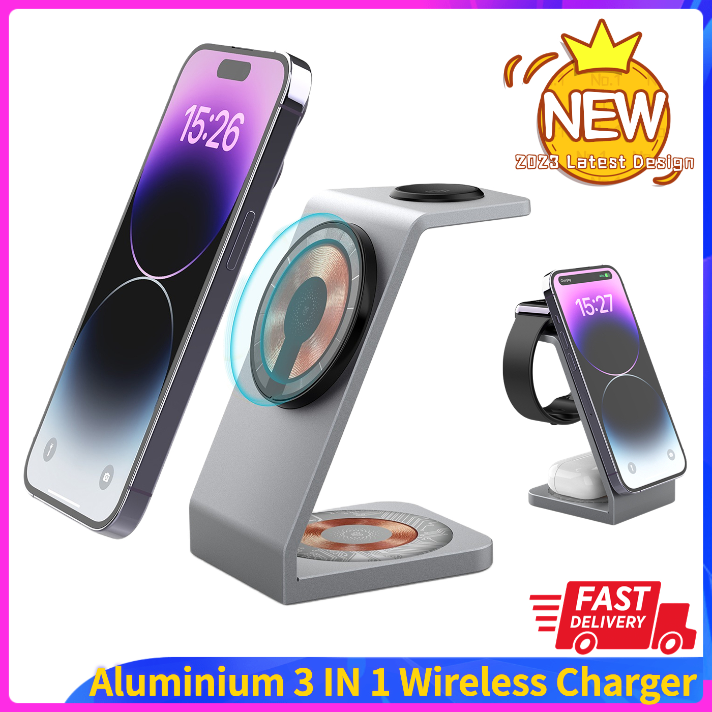 【3-in-1 Wireless Charging】 - 2023 Latest Design, features a magnetic aluminium wireless charger designed for Apple Users. To enjoy a 15W Charging experience please use a 20W QC Adaptor. (sold separately)