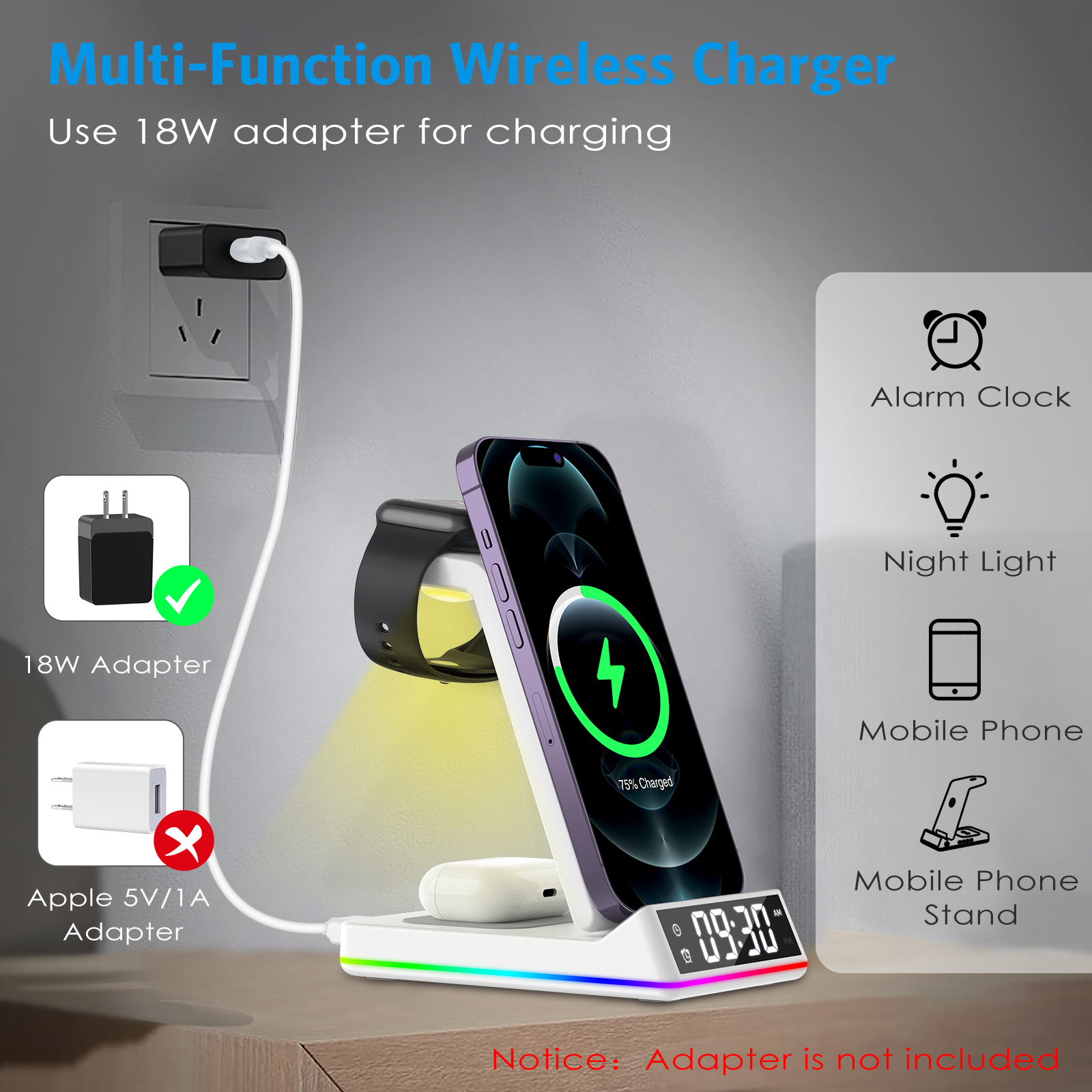 Specification: 1. Input voltage: 9V2A 2. Wireless output: 5W-7.5W-10W-15W 3. Airpods output power: 5W 4. iWatch output: 2.5W 5. USB interface output: 10W 6. Material: ABS+PC 7. Product color: white 8. Transmission distance: 3-8mm 9. Charging efficiency: 80%-85% 10. Working frequency: 100-205KHZ packing list: 1 * Wireless Charger 1 * USB-C data cable 1 * User Manual