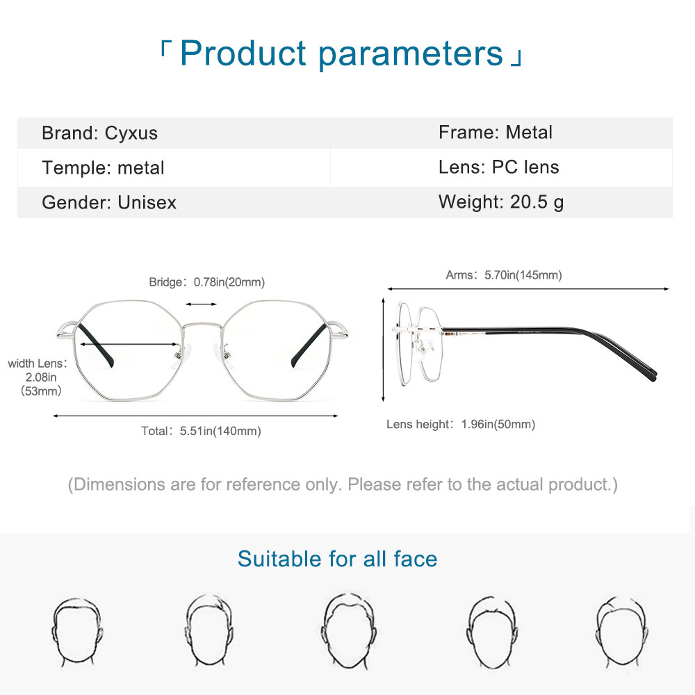 Aviation-gradePC lenses are stable, non-friable and explosion-proof. Combined with the latest tech, designed using the HEV-Adsorb substrate absorptiontechnology. It canabsorb high-energy blue lightand provide 100% UV protection. Protecting your eyesightand eye skin, excellent comfort and high safety give you all-day protection at your digital life.Not only protect your beautiful eyes, but also combine trendy design.Metal octagon frame with various colors fit different fashion look for men/women.