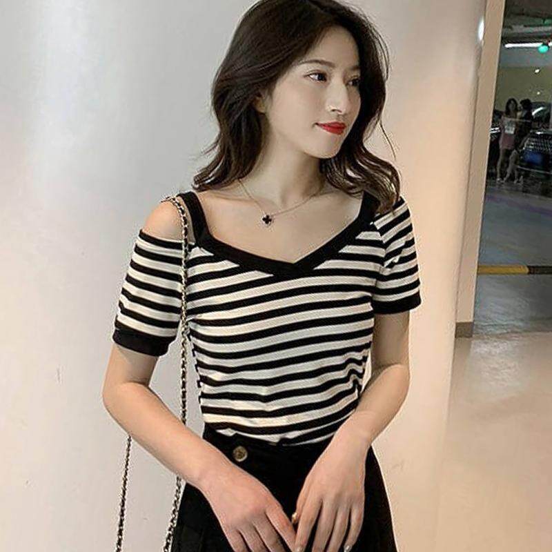 INWPLLR Women's Fashion Tops Summer Wear Striped Tshirt V-neck Short Sleeve Women T-shirts Korean Tee Shirt Women Off Shoulder Tops Tshirts