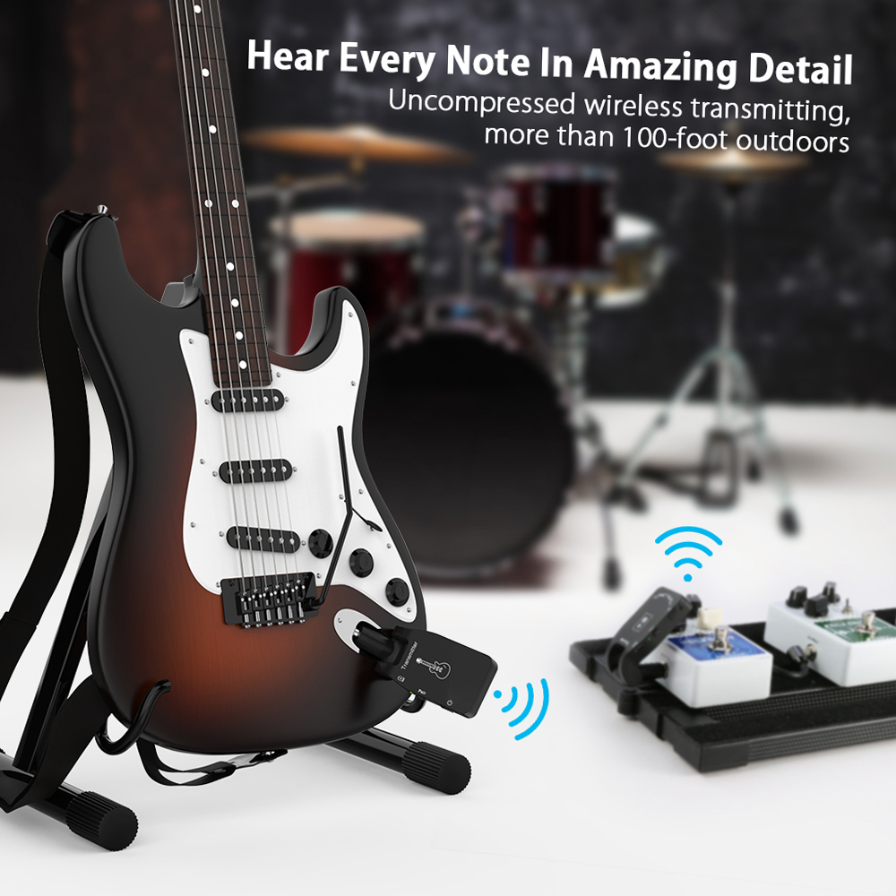 2.4G wireless guitar system with rechargeable transmitter and receiver, is available for most electric musical instruments, such as electric guitars, bass, electric-acoustic guitars, etc. 20-20KHz wide frequency response, 24bit/ 48KHz uncompressed signal transmission and without the trouble of long connection cables, you can enjoy your guitar tone in amazing and excellent details on your guitar amplifier with our ammoon 2.4G wireless guitar system anytime anywhere.
