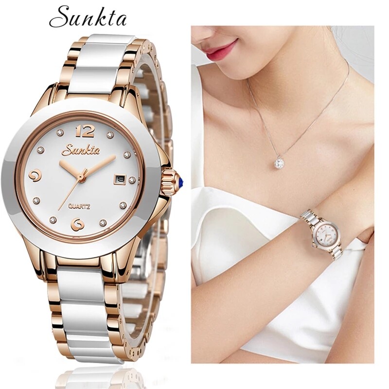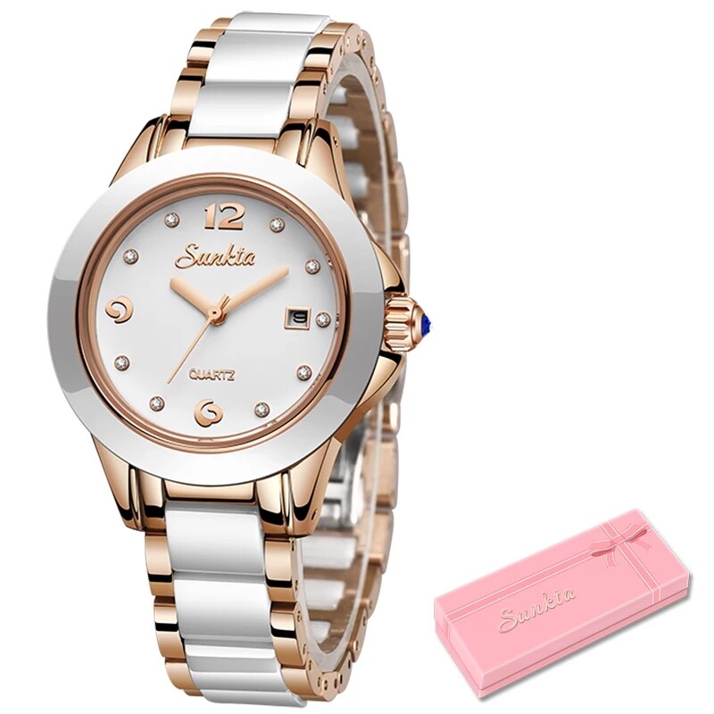 Brand: SUNKTAStyle: leisure, businessDisplay: SimulationSport: Original quartz movementDial: There are many crystal diamonds inside the dialButton: There is a sapphire on the buttonMain features:- 100% brand new label and high quality;- Waterproof (supports cold water shower and swimming, do not operate the watch when underwater);- High quality zinc alloy case;- Premium stainless steel ceramics strap;Specifications (approximate):- Case diameter: 2.8 cm- Case thickness: 0.9 cm- Bandwidth: 1.4 cm- Total length: 18 cm- Product weight: 70g