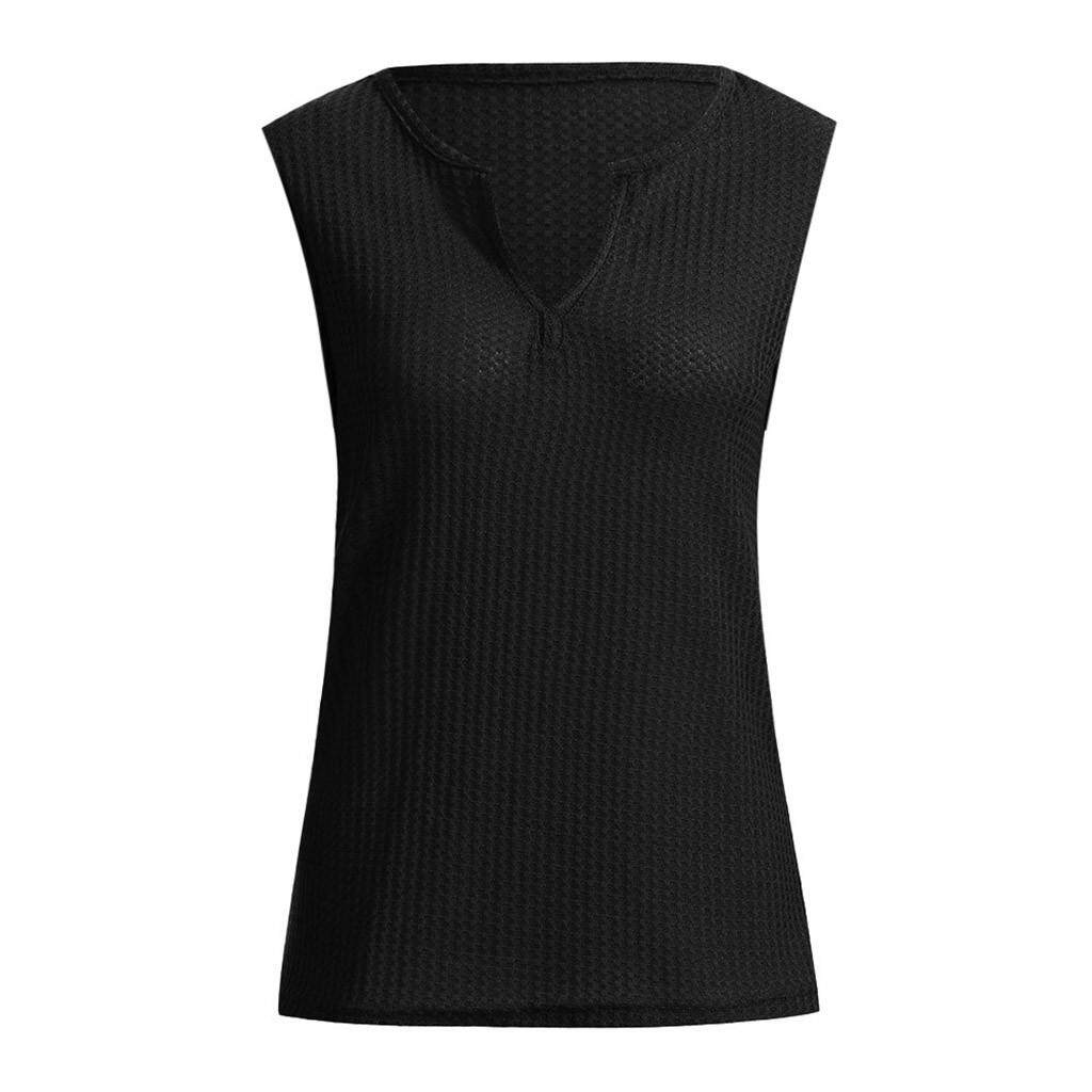 Womens Fashion V Neck Shirts Sleeveless Solid Waffle Knit Loose Fitting Tee Tops