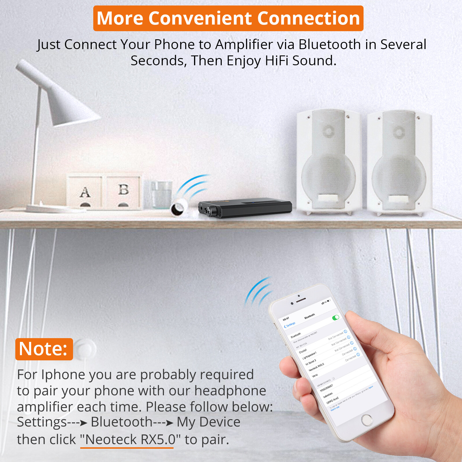 For Iphone you are probably required to pair your phone with our headphone amplifier each time. Please follow below: Settings---Bluetooth---My Device, then click "Noteck RX5.0" to pair.